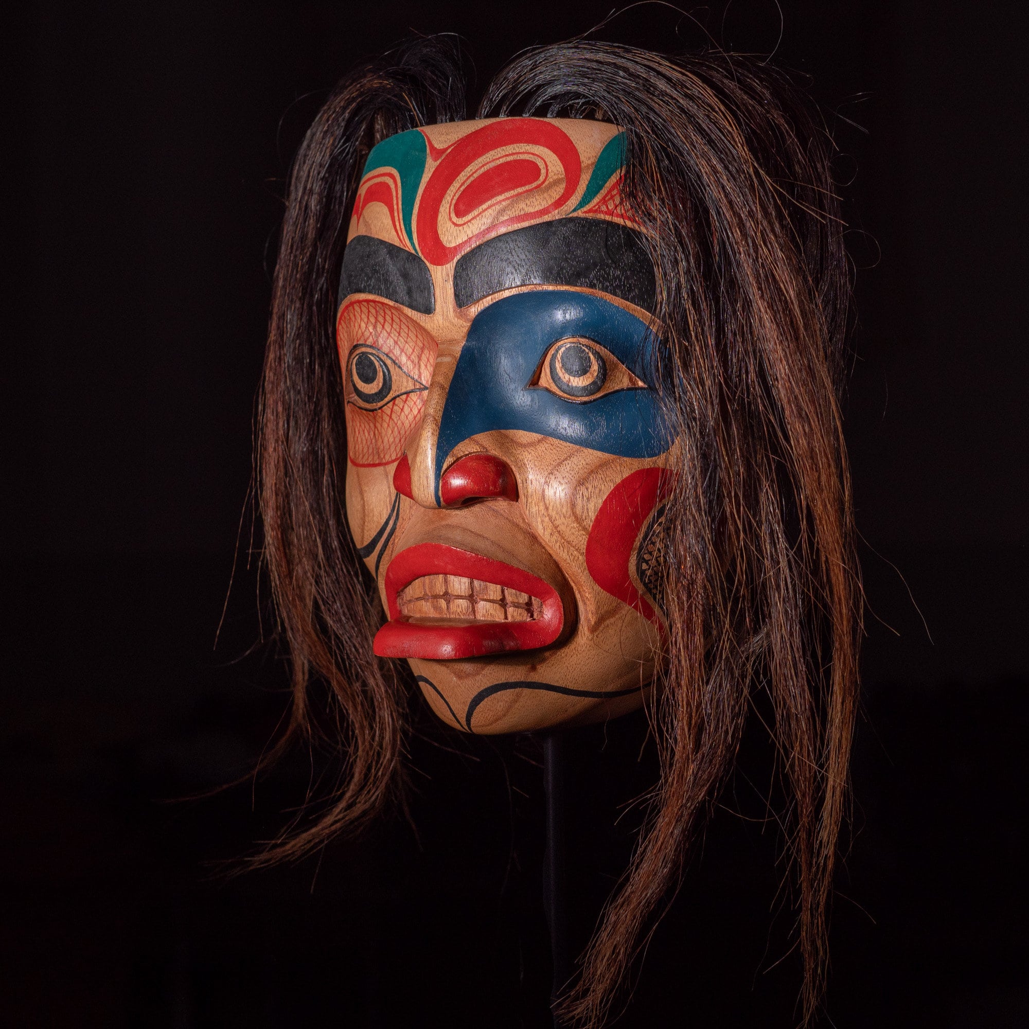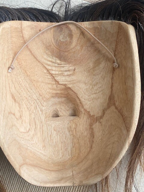 Keep your piece out of direct sunlight and away from moisture. A light dusting or occasional wood-safe polish will help preserve its beauty. If you’ve chosen a mask with horse hair or goat hair, and the hair has compressed in shipping, simply comb the hair. in extreme cases, use hairspray and a comb to restore the shape of the hair.