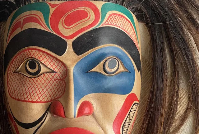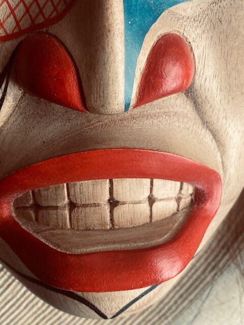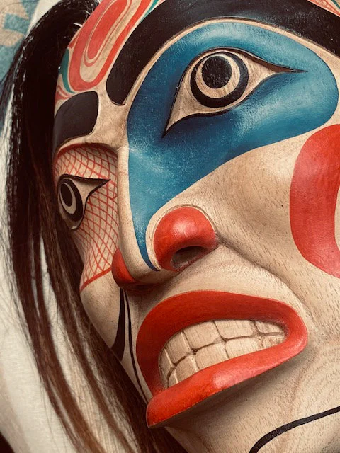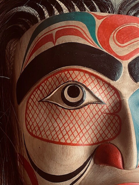 Painstakingly crafted in the style of Northwest Coast ceremonial masks, this piece is a museum-inspired reproduction made using traditional carving techniques and hand-painting methods. While not made by a tribal member, it is created in respectful homage to the cultural artistry of Indigenous communities from coastal British Columbia and Alaska.